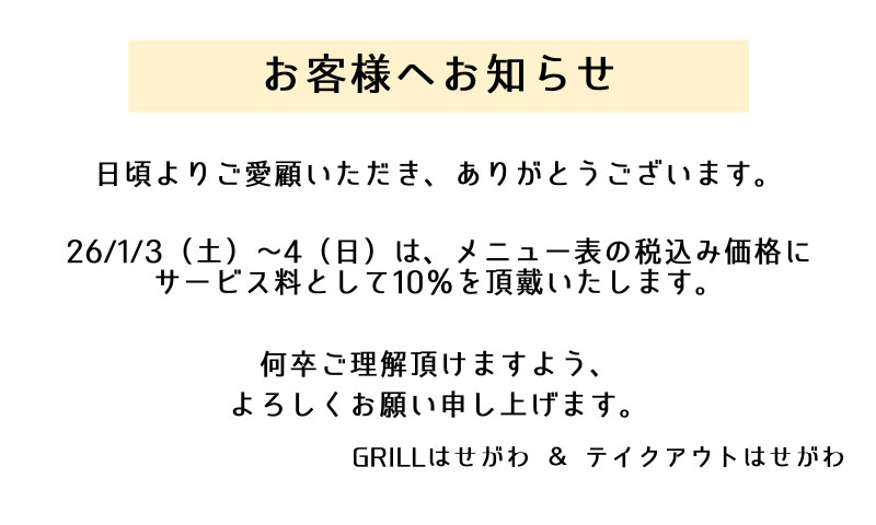 Shop Information 定休日・営業時間変更のお知らせ 2025.06.28 月・火は定休日、平日の夜営業を再開いたしました。 お正月サービス料のお知らせ 2025.12.30 1月3日から4日までは10%のお正月サービス料を頂戴いたします。 無料駐車場はこちら【地図】 2024.11.01 当店北に4台分の駐車場(パークベラージオ)があります。